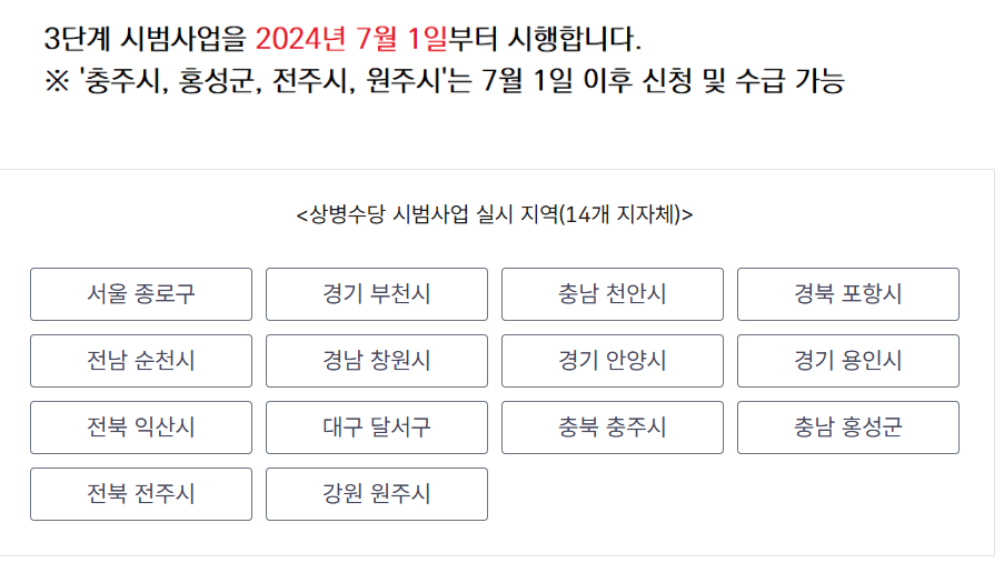 상병수당은 시범사업 지역에서 먼저 시행 중이며, 정해진 조건이 충족이 되면 신청할 수 자격이 주어집니다. 필요한 조건을 아래에서 확인해 보시기 바랍니다.